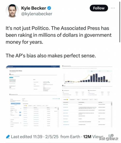 马斯克转发凯莉·贝克尔的另一条推文就把矛头对准了美联社,说美联社多年来接收了政府数百万美元的资金,其报道具有偏见就言之成理了。