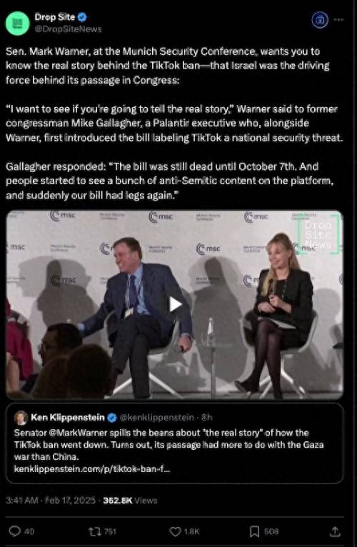 在刚刚结束的慕尼黑安全会议上,美国政客的一番言论揭示了TikTok封禁背后的惊人隐情:美国打压TikTok,并非担心所谓的“数据安全”,而是出于对以色列及亲以势力的保护。