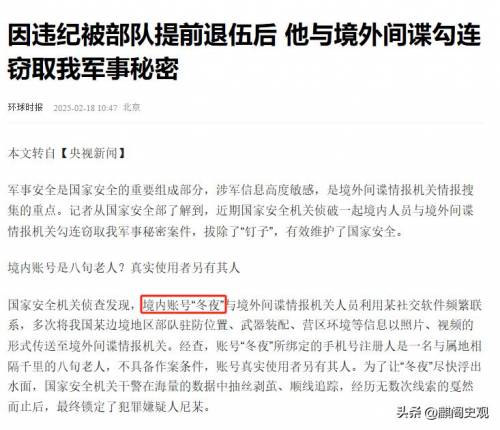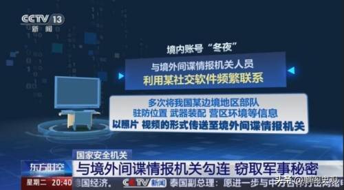 据《光明网》2月18日报道,经国家安全机关调查,境内账号“冬夜”与境外间谍机关人员,利用社交媒体软件进行频繁联系。