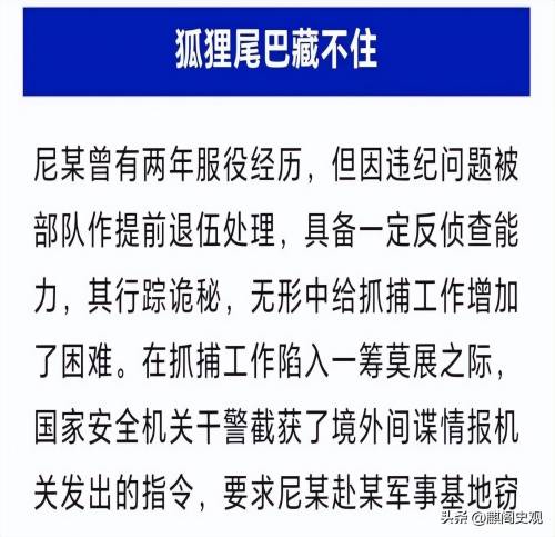 在信息中,他们要求尼某前往某军事基地进行窃密,得知此事后,国安部门立即派人进行埋伏,等待尼莫的到来。