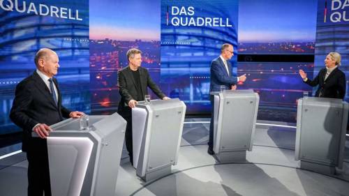 2月16日,朔尔茨、哈贝克、默茨、魏德尔等四名总理候选人参加电视辩论。