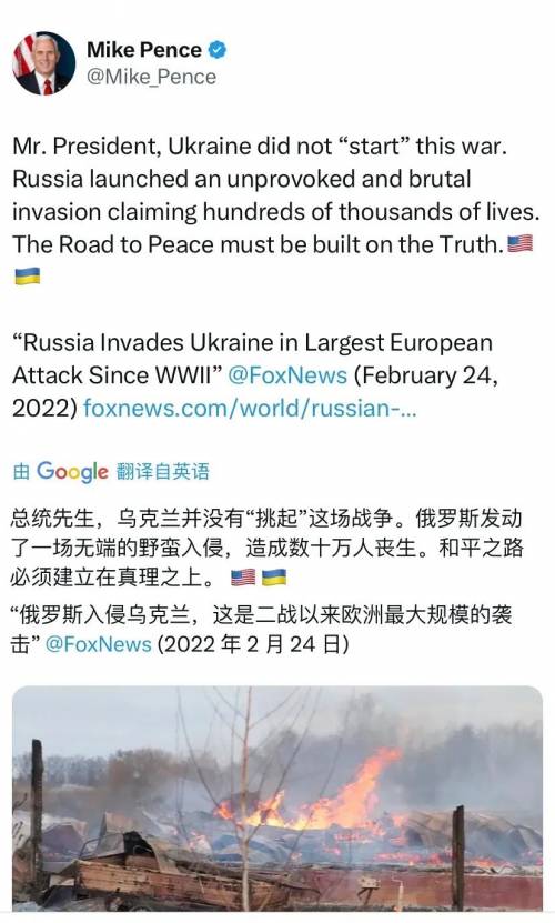2 月 19 日,美国前副总统彭斯在社交媒体公开批评特朗普对俄乌冲突的言论,称其 “扭曲真相”,并强调 “特朗普总统先生,乌克兰并没有‘挑起’这场战争。俄罗斯发动了一场无端的野蛮入侵,造成数十万人丧生。和平之路必须建立在真理之上。‘俄罗斯入侵乌克兰,这是二战以来欧洲最大规模的袭击’。”