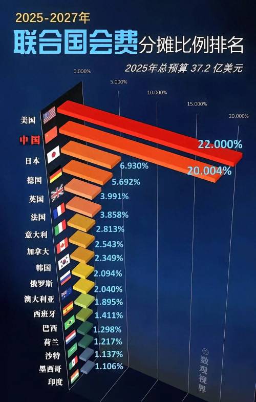 最近,联合国向外公布了2025-2027年度会费的分摊比例,家里有矿的前三名分别是: