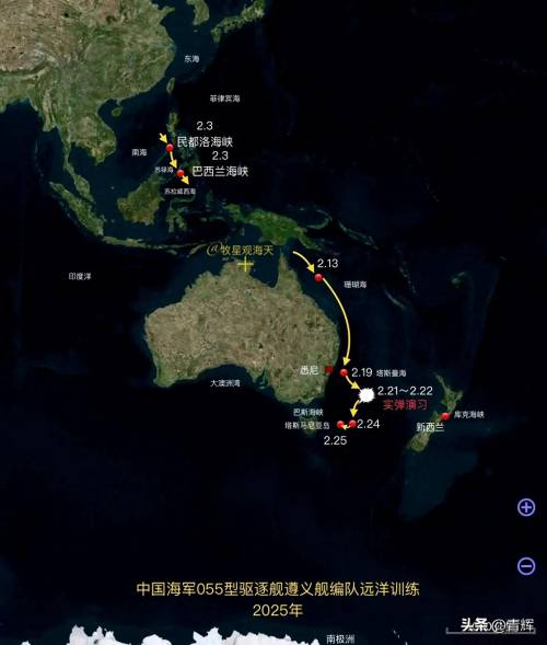 根据长期关注相关局势的军事博主发布的这支远洋编队的轨迹图能够发现,22号在塔斯曼海进行了实弹演习之后,24号的时候,我们的这支编队继续向南航行,然而到了25号,突然调转了一个方向,向澳大利亚的塔斯马尼亚岛接近。对于这种情况,新西兰媒体网站也迅速发布了相应的消息。
