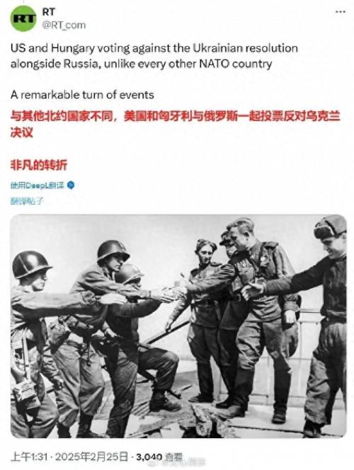 估计乌克兰与欧盟看到这样的投票结果直接就懵了!想当初,美国可是欧盟和乌克兰的“带头大哥”啊!怎么我们的“带头大哥”直接和敌人的“带头大哥”站在一起反对我们了?对此,《华盛顿邮报》甚至认为,这标志着美国与欧洲的重大决裂,而《今日俄罗斯》特意配了一张美军与苏联红军“易北河会师”的照片来讽刺乌克兰与欧洲!