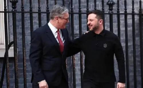 当地时间3月1日,乌克兰总统泽连斯基和英国首相斯塔默在伦敦唐宁街10号首相府上演了“兄弟情深”。