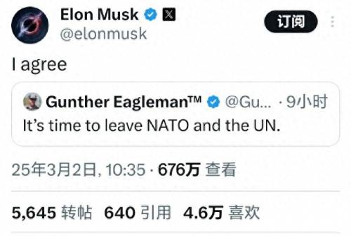 3月1日,迈克·李在社交平台发帖,再次呼吁美国退出北约。一名网友转发了相关内容并配文写道:“(美国)是时候离开北约和联合国了。”马斯克转发了该网友的评论并表示“我赞同。”