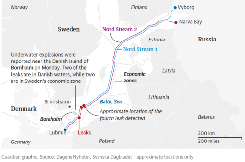 “北溪”管道的四个泄漏点 英国《卫报》制图
