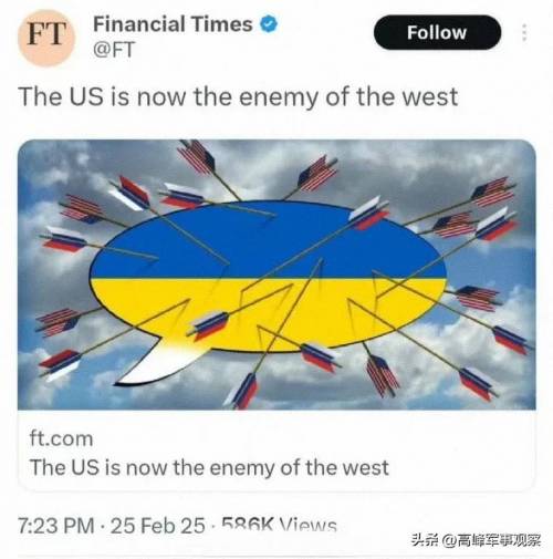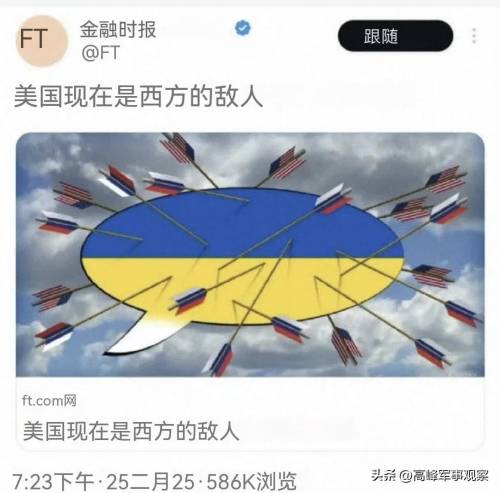 更让特朗普想不到的是,西方阵营已经把美国开除了,并与美国势不两立。英国《金融时报》称,英国认为,美国现在已经成为西方的敌人了。这意味着,美国接下来在北约、G7框架中以及与欧盟打交道时都会被彻底反对和孤立。当然,欧盟对乌支持态度和对美强硬态度能维持多久,还是未知数。大多数外部观察家不看好英国和欧盟当前的相关外交政策。