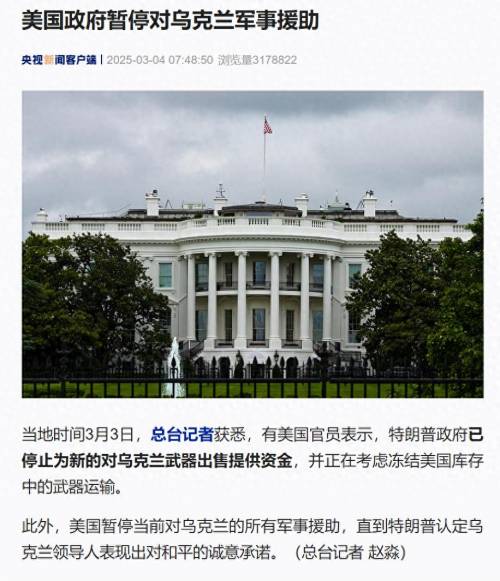 当地时间3月3日,有美国官员表示,特朗普政府已停止为新的对乌克兰武器出售提供资金,并正在考虑冻结美国库存中的武器运输。此外,美国暂停当前对乌克兰的所有军事援助,直到特朗普认定乌克兰领导人表现出对和平的诚意承诺。