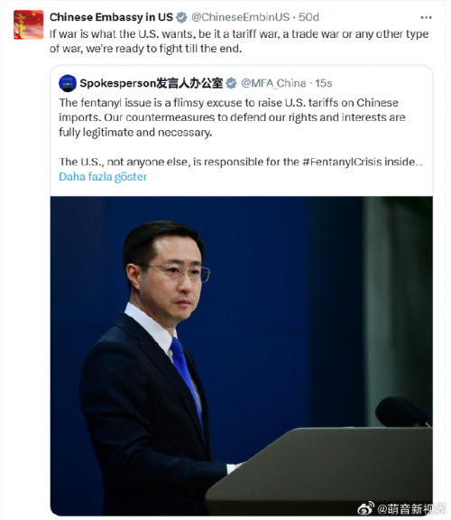 对外交部发言人这段话,中国驻美大使馆进行了转发,然后也说了一段话:如果美国想要战争,无论是关税战、贸易战还是任何其它形式的战争,我们都准备战斗到底。