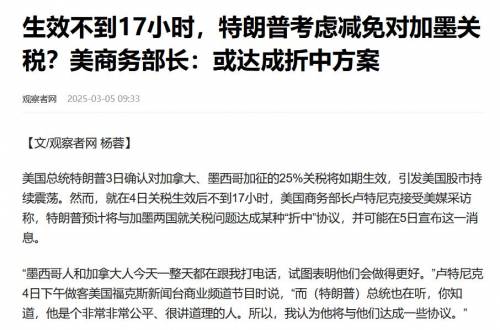 墨西哥没投降、加拿大没投降,反而却是美国先出来表态要给两国减负,只能说,特朗普确实有些玩砸了。