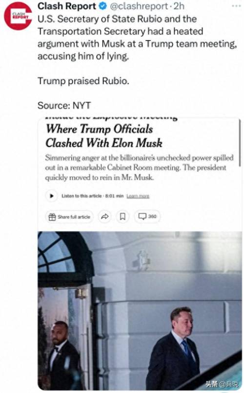 包括《纽约时报》《国会山报》、路透社等家媒体,均援引了知情人士的说法,详细描述了马斯克与鲁比奥在3月6日内阁会议上的争执细节。以下是根据多家媒体的碎片化信息攒起来的大概场景: