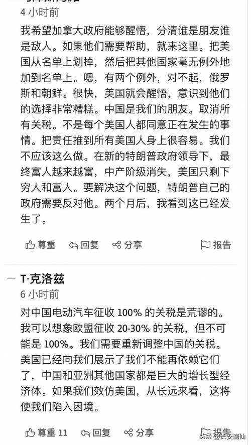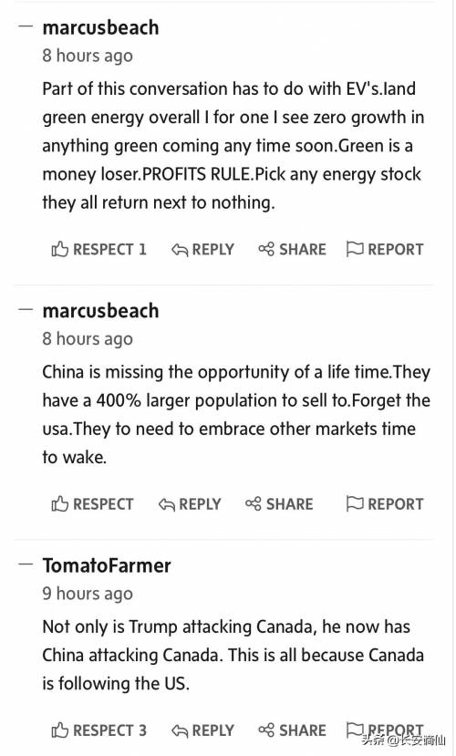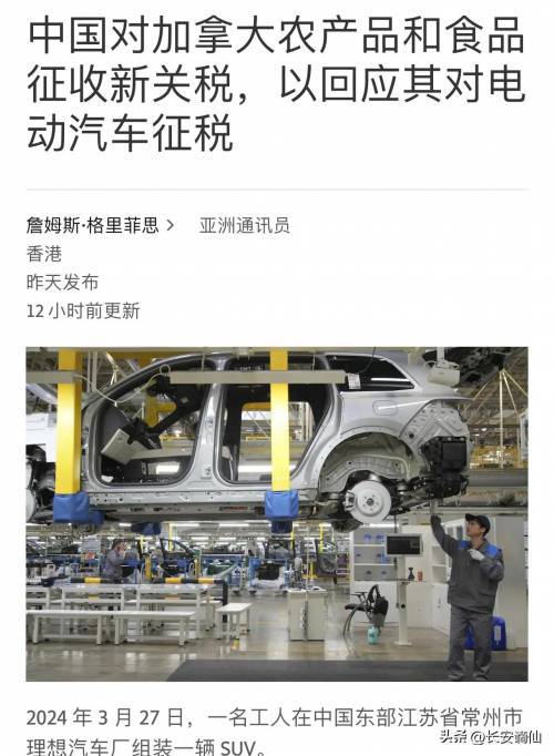 首先我发现,加拿大媒体对于成因是心知肚明的,基本都认为去年 8 月,加拿大决定对电动汽车征收 100% 的关税,加拿大对电动汽车征收关税是在美国采取类似举措并与拜登政府磋商后采取的,这让东大那边抱怨渥太华在外交政策上追随美国。2 月底,现任美国财政部长斯科特·贝森特鼓励加拿大效仿墨西哥,对中国征收新关税。