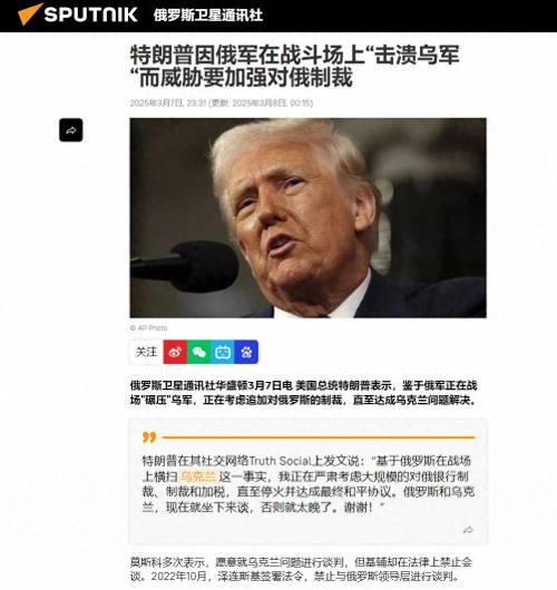 特朗普有点慌了,美国已经停止对乌援助,欧洲却要接过美国的大棒继续援助乌克兰,现在俄罗斯又接连攻下七个城镇,这玩法是不是美国通俄要搞垮乌克兰?现在特朗普已经不再惧怕戴上“通俄门”的帽子,但老特也不想背上骂名啊,因此在3月7日的社交媒体上特朗普就表示,美国正在考虑大规模的对俄银行制裁、高科技制裁和加征关税,直至停火并达成最终和平协议!