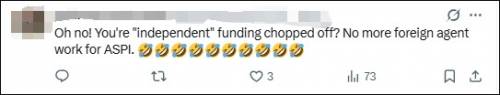 “哦豁!‘独立智库’的资金被切断啦?ASPI这下做不成外国代理人的勾当咯。”