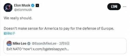 ▲马斯克3月9日在社交媒体上表示,支持美国退出北约。此前,他曾在社交平台X上发帖对北约提出批评,并呼吁对其进行彻底改革。