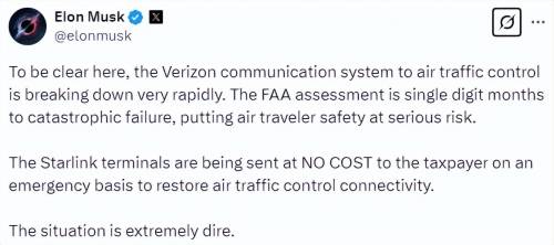 马斯克进一步指出,FAA的通信系统已经“迅速崩溃”,并宣布其旗下的Starlink将紧急介入,免费提供终端设备以恢复空中交通控制的连接。