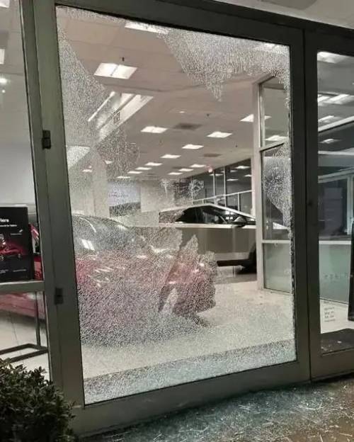 ▲俄勒冈州塞勒姆市一家特斯拉经销商受损的橱窗。(图源:美国俄勒冈州地方法院)