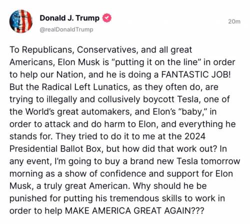 在美股暴跌的周一,特斯拉股票尤其跌超15%,它已经从去年12月的最高点下跌超54%,腰斩有余,这是惊人的雪崩。特朗普周一晚上破天荒地发帖力挺马斯克,说马斯克是一个“真正伟大的美国人”。特朗普还宣布他将新买一辆特斯拉车。特朗普总统亲自号召大家挺马斯克,买特斯拉,恰恰反映了马斯克处于一个什么样的危局。