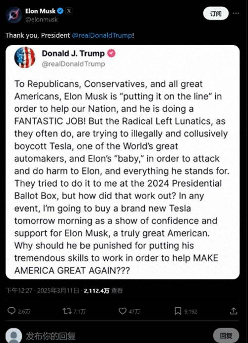 3月11日,马斯克转帖了特朗普发表“真相社交”平台上的动态并表示感谢!特朗普在动态中对马斯克赞不绝口,称马斯克是一个伟大的美国人,为什么要让一个用自己高超的管理艺术治理美国的人受到惩罚?在马斯克正在美国内遭受抗议、特斯拉汽车被恶意攻击的时刻,特朗普的支持让马斯克非常欣慰!