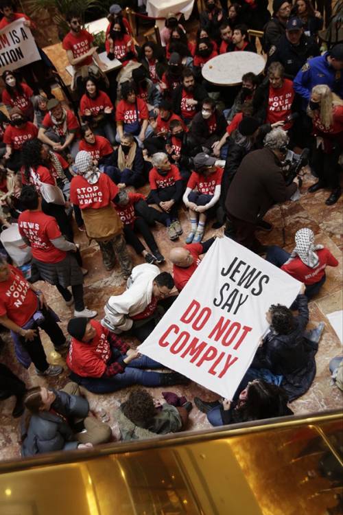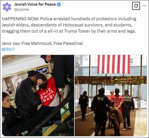 “犹太和平之声”发文称,警方逮捕了数百名抗议者,其中包括犹太长者、大屠杀幸存者的后代和学生,并将他们拖出了特朗普大厦的静坐抗议场所。