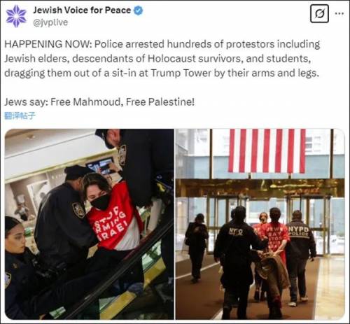 “犹太和平之声”发文称,警方逮捕了数百名抗议者,其中包括犹太长者、大屠杀幸存者的后代和学生,并将他们拖出了特朗普大厦的静坐抗议场所。
