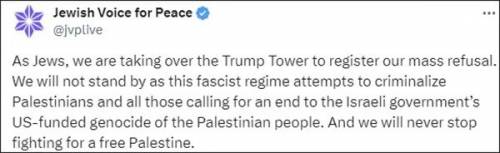 “犹太和平之声”在社交平台X上发文称,“当这个法西斯政权企图将巴勒斯坦人和所有呼吁结束以色列政府在美国资助下对巴勒斯坦人民进行种族灭绝的人定为非法时,我们不会袖手旁观。我们永远不会停止为自由的巴勒斯坦而战。”