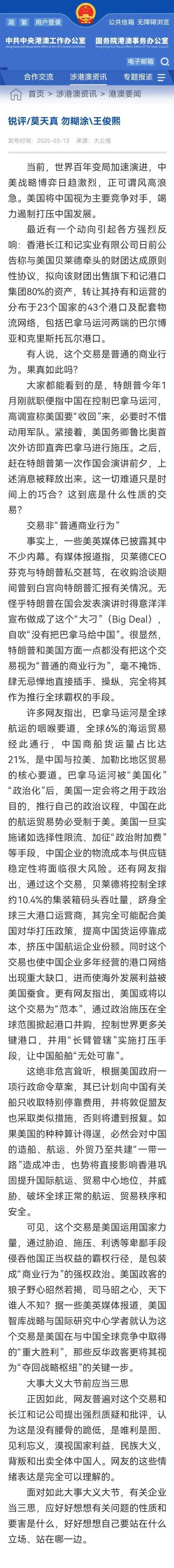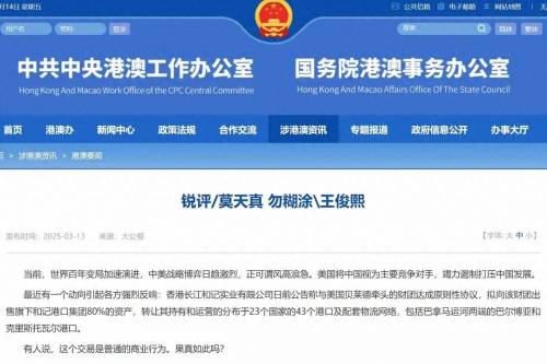 近日,对香港首富李嘉诚旗下公司要甩卖巴拿马港口的事件,中共中央港澳办官网在沉寂了十天之后,罕见转载《大公报》重磅锐评《莫天真,勿糊涂》,直接点名长和“需三思大义”,更让李家甩卖港口的事件上升到国家层面!