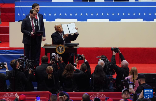 1月20日,在美国首都华盛顿第一资本体育馆,美国总统特朗普展示其签署的行政令。图源:新华社