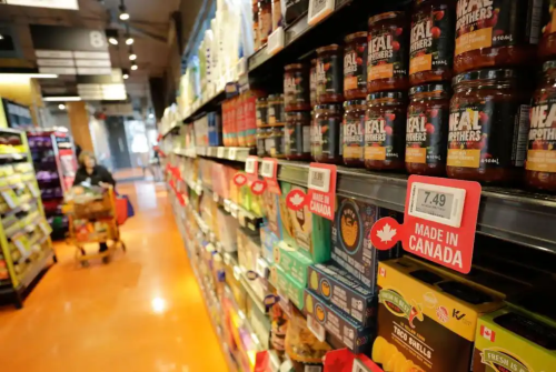2月25日,在加拿大温哥华一家超市内,加拿大商品的旁边贴着印有“加拿大制造”的标签。图源:新华社