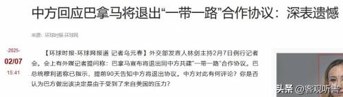 信息来源:《中方回应巴拿马将退出“一带一路”合作协议:深表遗憾》环球时报-环球网-2025- 02/07 15:41