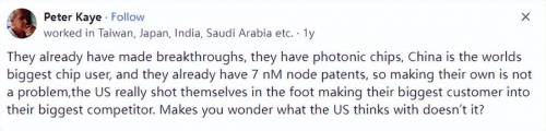 还有一个外国网友表示到,现在中国的芯片科技已经有了一定的进展了,并且中国已经具备了研制光子芯片的能力。