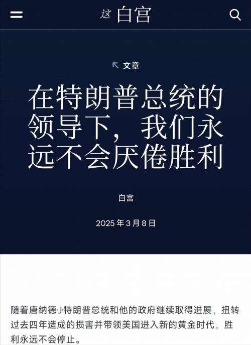 再看白宫官网主页面,从 “在特朗普的领导下,我们无所不赢”,到将每周简报几乎变成 “每周一赢了”,以及在泽连斯基大闹白宫时,歌颂特朗普总统和万斯副总统为美国人民挺身而出,无一不在彰显着对特朗普的过度吹捧。