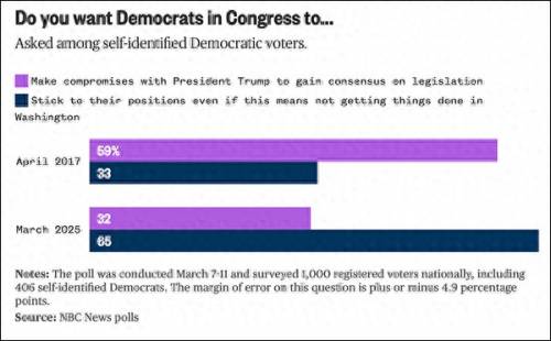 最新民调显示,65%的民主党支持者认为不应该向特朗普妥协,而2017年这一比例为33%。 美国国家广播公司(NBC)民调