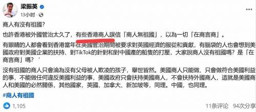 现在,继《大公报》和港澳办之后,现任副国级政协副主席、也是前任香港特首的梁振英也于17日在社交平台发声。他说也许是因为香港被外国人管治太久了,让一些香港商人误信了“商人无祖国”的说辞,把所有的商业交易都放入“在商言商”的范畴。但只要有眼睛、有脑子的人就能看到真相。他更是强调没有祖国的商人就像没有妈的孩子,注定会倍受欺凌,举世皆然、四海皆准。