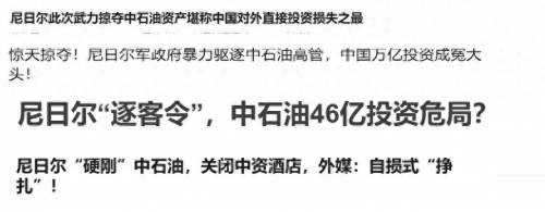 最近网上有一则消息传得沸沸扬扬,说西非国家尼日尔没收了中国石油企业4亿美元投资并驱逐中企高管,更离谱的说法还有“尼泊尔政府掠夺中企46亿美元资产”,以及“中国在尼泊尔万亿投资即将打水漂”等等。