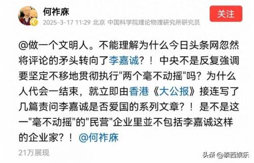 极目新闻2025-03-17 ——港澳办三天内两次转载《大公报》评论,向香港长和发出五连问“在大是大非面前,企业家应怎么取舍”