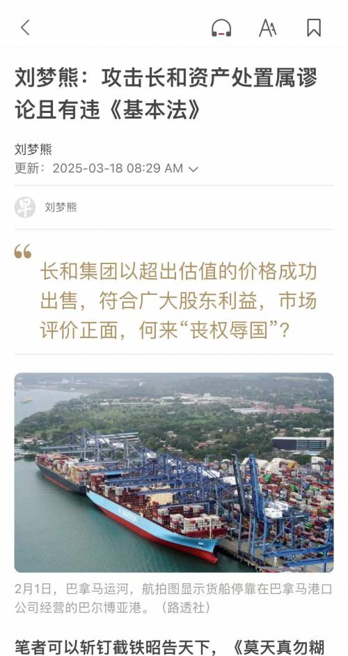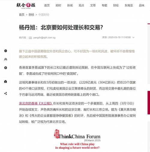 而这个时候,新加坡联合早报连发多篇文章为李嘉诚说话,一篇是《中方如何处理长和交易》的文章指出,特朗普再次入主白宫、打起巴拿马运河的主意后,长和果断抛售烫手山芋,明显是不想被卷入激烈的中美博弈。这是保护自身利益的合理选择,也是一种常见的商业策略。