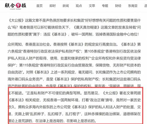 "攻击长和资产处理属谬论且有违《基本法》。”新加坡联合早报的另一篇社论以此为标题指出,长和集团以超出估值的价格成功出售,符合广大股东的利益,市场评价正面,何来“丧权辱国。”并进一步指出,香港按照《基本法》的规定实行高度自治。《基本法》第六条规定“香港特e行政区依法保护私有财产权”。