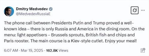 用梅德韦杰夫的话说:“在餐厅里只有俄罗斯和美国,菜单上有布鲁塞尔卷心菜、英国炸鱼薯条和巴黎公鸡这几道开胃菜,而主菜是基辅肉饼,祝您用餐愉快!”