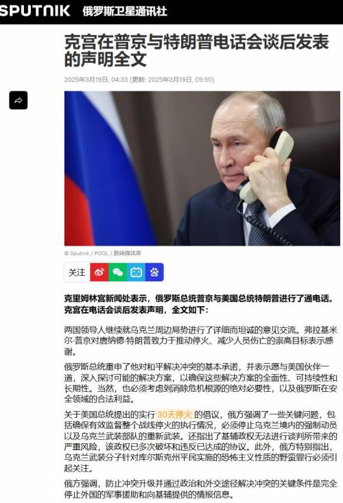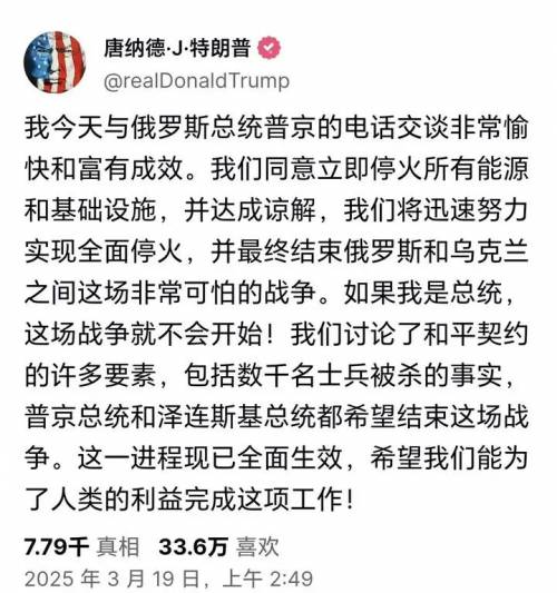 这个世界变化之快,不得不让人感慨,拜登时代的美俄关系还深陷"外交驱逐战"的冰点时,如今在特朗普和普京煲了一个90分钟的电话粥后,要开始全面加强合作了。特朗普前脚刚把"结束战争"的功劳簿揽入怀中,普京后脚就配合地按下了军事暂停键。看双方事后通稿不难猜测特朗普已经得偿所愿?