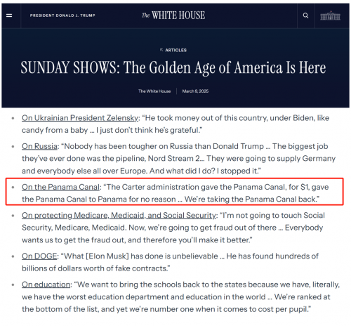就在那周末,已经每天都要宣传自己“赢麻了”的白宫官网,在题为《美国的黄金时代已经到来》的Sunday Show中,引用了一排特朗普总统要将美国带回“黄金时代”的“宣言”,再次叫嚣巴拿马运河是“被无缘无故送走的”,“我们将夺回巴拿马运河”。