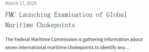 不得不说,特朗普经过裁员之后的政府班子效率非常高,宣言发布仅仅三天后,3月17日,美国联邦海事委员会(FMC)宣布,启动对全球范围内海运咽喉要道的专项审查。