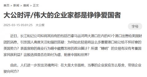 3月15日,大公报又发表了一篇题为《伟大的企业家都是铮铮爱国者》的评论,且港澳办官方网站再次转载了这篇评论。