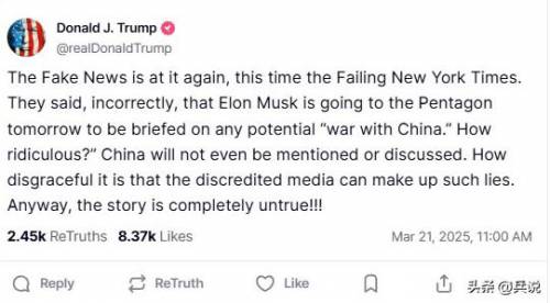 不过,特朗普这边的反应就不那么“和气”了。在看到《纽约时报》的报道后,特朗普立马在“真相社交”平台发声,指责媒体“荒谬”和“无耻”。他说马斯克根本不会听到关于中国的任何东西,简直是“假新闻”。看得出来,特朗普对马斯克与五角大楼之间的关系非常敏感,毕竟,马斯克可是特朗普背后重要的支持者之一,特朗普也不愿意看到马斯克过于接近美国军方,尤其是在如此敏感的时刻。