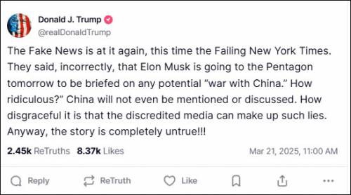 “假新闻又来了,这次是正在衰落的《纽约时报》。”特朗普20日深夜在“真相社交”平台上说,“他们错误地报道说,埃隆·马斯克明天将前往五角大楼,接受关于可能与中国开战的简报。多么荒谬啊!中国甚至不会被提及或讨论。可耻的是,这些失去信誉的媒体竟然能编造这样的谎言。总之,这个故事完全是假的!!!”
