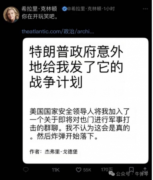 旁听完聊天后,戈德堡大笔一挥,写了一篇文章,《特朗普政府意外地给我发了它的战争计划》。