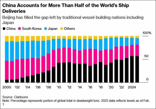 中国造船业可以满足任何需求,而且交付速度快,价格便宜,形成了举世无双的竞争力。根据美国贸易代表办公室的数据,按吨位计算,中国目前生产的货船占全球现役货船总量的一半以上,而美国造船厂2024年仅建造了全球0.01%的货船。特朗普政府指控中国“通过补贴不公平主导造船业”,他们声称要通过征收港口停靠费重振美国造船业。