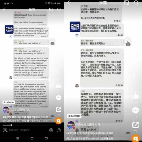 聊天中,华尔兹、万斯、赫格塞斯等人还谈到不想帮助欧洲、向欧洲征税、拒绝欧洲搭便车。